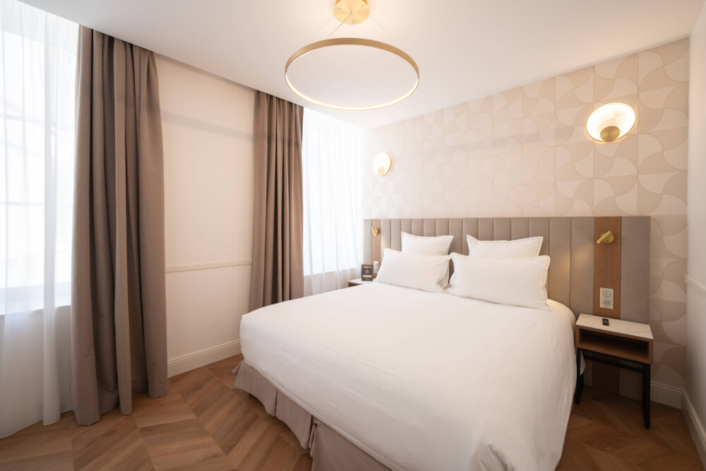 L’accès à la Suite Prestige se fait par l’ascenseur pour un confort maximal, mais aussi par l’escalier. La décoration épurée de la chambre est rehaussée par du papier peint sur le mur de la tête de lit, ajoutant une touche subtile de couleur à l’ensemble. L’aménagement avec des matériaux en bois couleur chêne clair crée une atmosphère chaleureuse et contemporaine, tandis que la salle de bain affiche une élégance intemporelle avec des effets de marbre blanc et veiné gris clair.