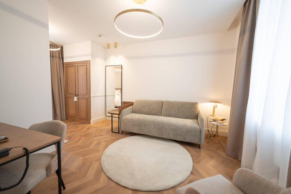 La Suite Prestige incarne le luxe discret de l’Hôtel Margaux à Epernay, au cœur de la région champenoise, offrant une expérience de séjour inoubliable.